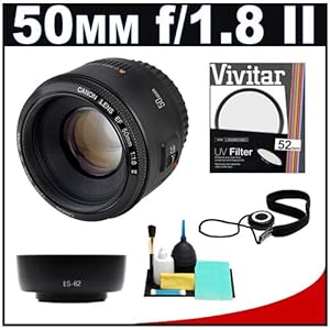 Canon EF 50mm f/1.8 II Lens + UV Filter + ES-62 Lens Hood + Accessory Kit for Canon EOS 30D, 40D, 50D, 5D Mark II, 7D, Rebel XS, XSi, XT, XTi, T1i Dig